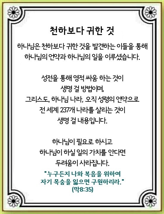 하나님이 필요로 하시는 일, 하나님이 하실 일의 가치를 안다면 두려움이 사라집니다. 죽음도 두렵지 않은 그 가치를 발견하는 오늘이 되기를 소망합니다.