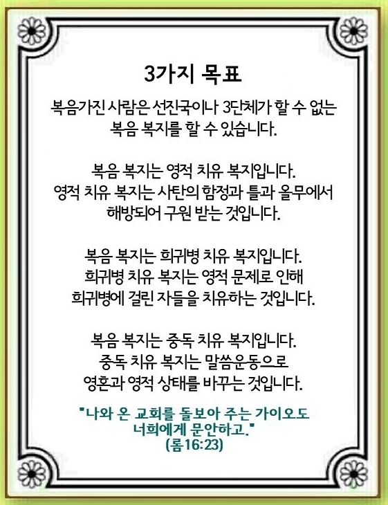 5가지 복지 시대(다민족 복지, 청소년 복지, 민간교도 복지, 정신치유 복지, 중독치유 사회복지)가 이미 다가왔습니다. 나는 세상이 하는 전문성을 갖췄나요? 나아가 복음 가진 하나님 자녀만 갖출 수 있는 시스템을 세우는 시작이 되기를 결단합니다.