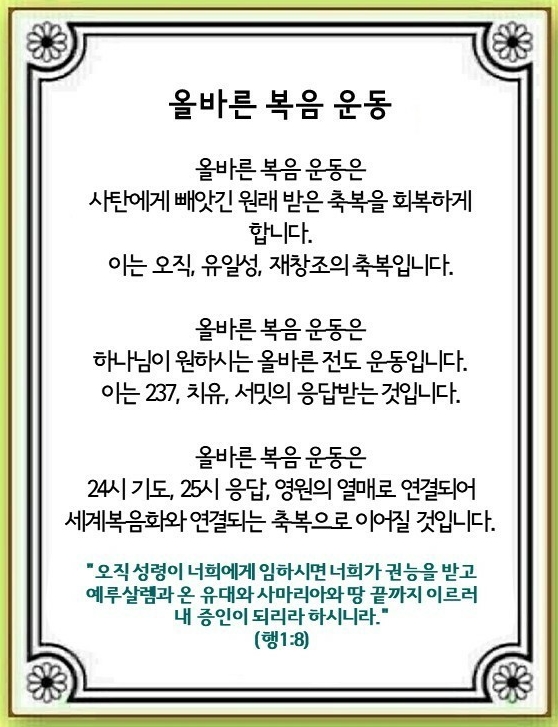 사탄이 인재와 현장, 경제까지도 빼앗아 버렸습니다. 우리가 이 속에 그리스도의 빛을 비추는 복음 운동과 전도 운동 가운데 있다면 흑암 세력은 반드시 무너집니다. 하나님은 지금도 구원 사역을 이루시고, 기도에 응답하시며, 전도 운동을 이어나가십니다. 여기서 오직, 유일성, 재창조의 축복을 찾을 수 있습니다. 하나님은 언제나 미리 응답을 주십니다. 이것이 원래 하나님 자녀가 받을 축복입니다.