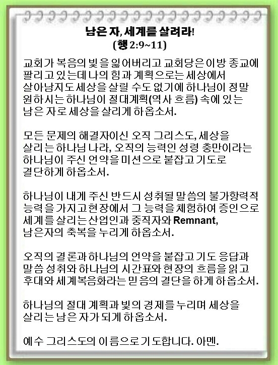 [언약 기도] 하나님의 절대 계획과 빛의 경제를 누리며 세상을 살리는 남은 자가 되게 하옵소서. 예수 그리스도의 이름으로 기도합니다. 아멘