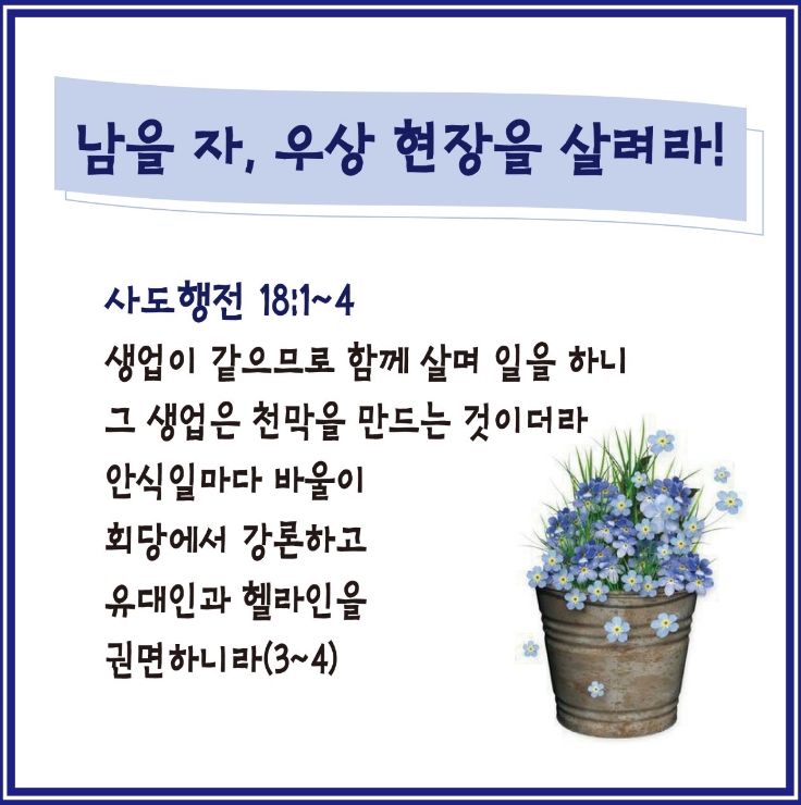 생업이 같으므로 함께 살며 일을 하니 그 생업은 천막을 만드는 것이더라 안식일마다 바울이 회당에서 강론하고 유대인과 헬라인을 권면하니라(3~4)