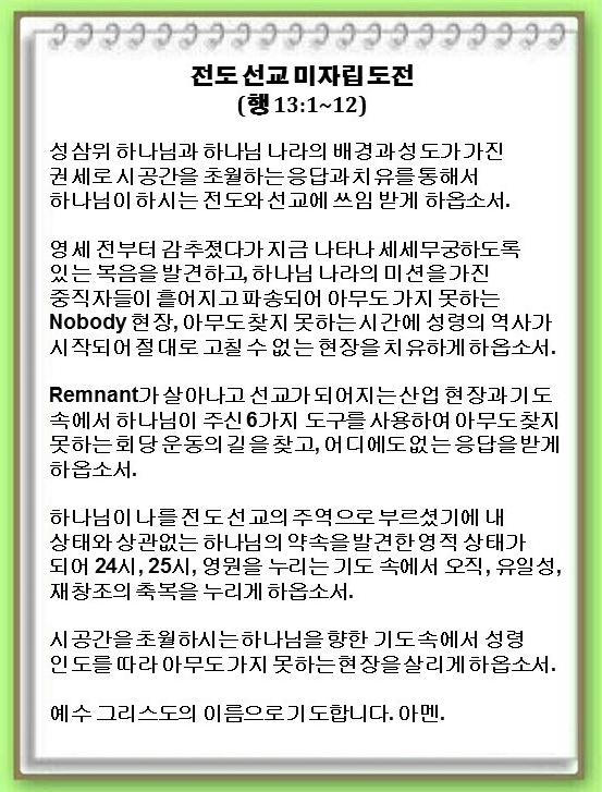 [언약 기도] 시공간을 초월하시는 하나님을 향한 기도 속에서 성령 인도를 따라 아무도 가지 못하는 현장을 살리게 하옵소서. 예수 그리스도 이름으로 기도합니다. 아멘