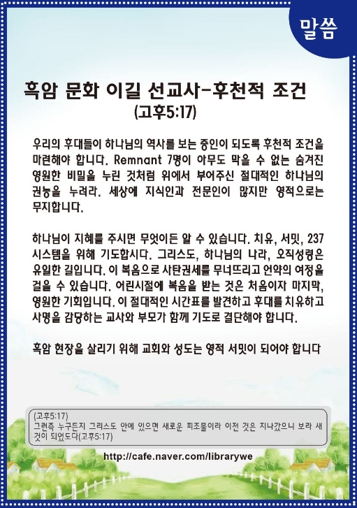 어린 시절에 복음을 받는 것은 어떤 의미일까요? 첫 번째 기회이고 마지막 기회이면서 영원한 기회입니다. 그만큼 중요하고 절대적인 시간표입니다. 후대들을 치유하고 살리는 사명을 감당하는 교사와 부모를 위해서 함께 기도를 결단하는 축복을 누려야 합니다.