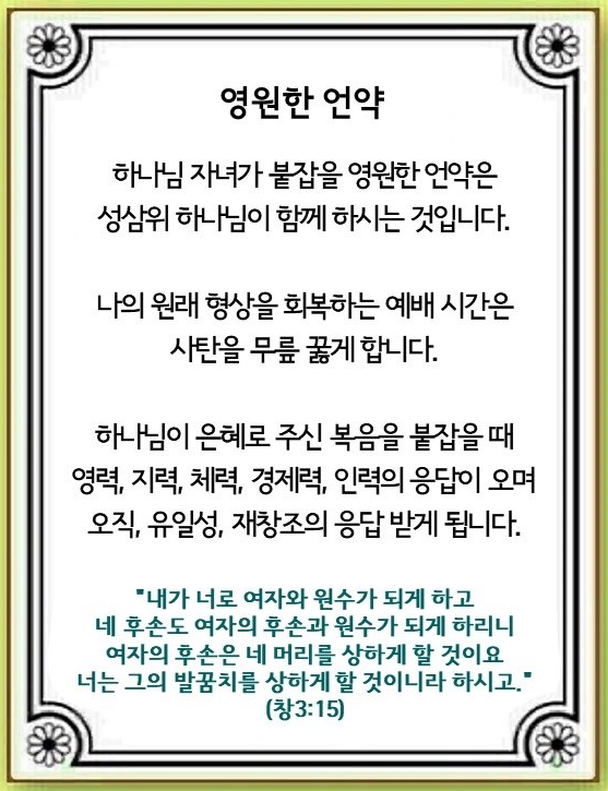 [언약 기도] 하나님! 영원한 복음의 언약을 붙잡고 영세 전부터 예비하신 축복을 회복하게 하옵소서. 예수 그리스도 이름으로 기도합니다. 아멘