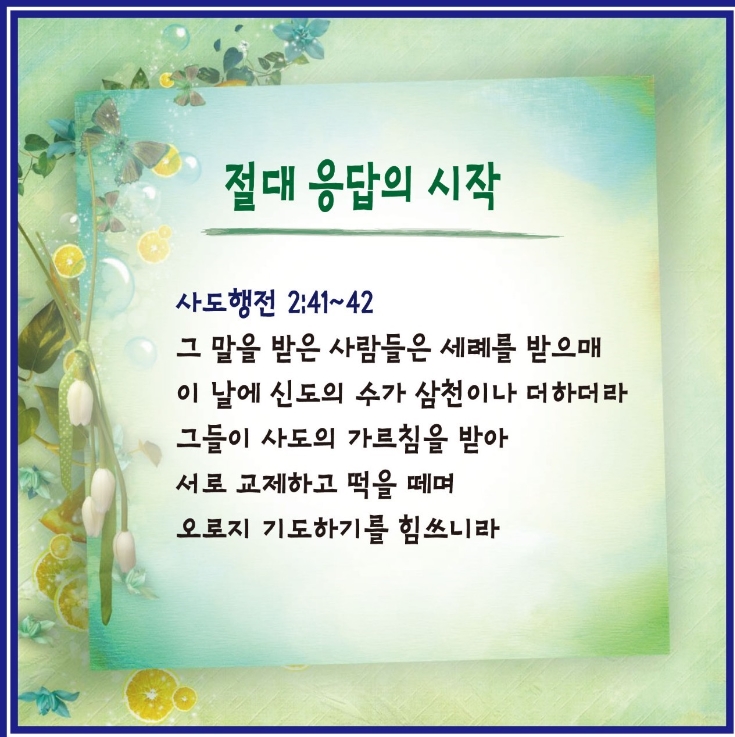 그 말을 받은 사람들은 세례를 받으매 이 날에 신도의 수가 삼천이나 더하더라 그들이 사도의 가르침을 받아 서로 교제하고 떡을 떼며 오로지 기도하기를 힘쓰니라