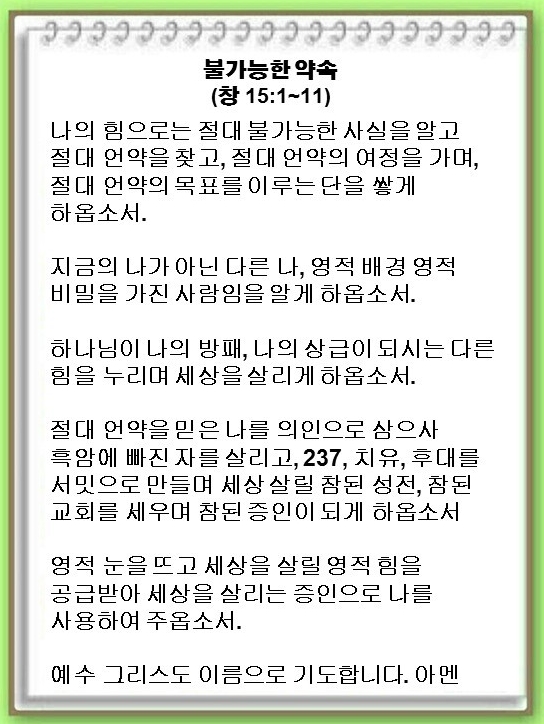 [언약 기도] 영적 눈을 뜨고 세상을 살릴 영적 힘을 공급받게 하옵소서. 세상을 살리는 증인으로 나를 사용하여 주옵소서. 예수 그리스도 이름으로 기도합니다. 아멘