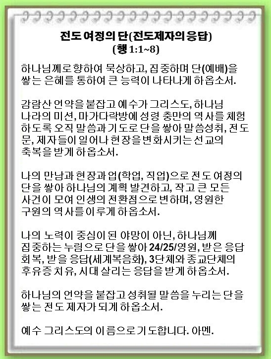 [언약 기도] 하나님의 언약을 붙잡고 성취될 말씀을 누리는 단을 쌓는 전도 제자가 되게 하옵소서. 예수 그리스도 이름으로 기도합니다. 아멘