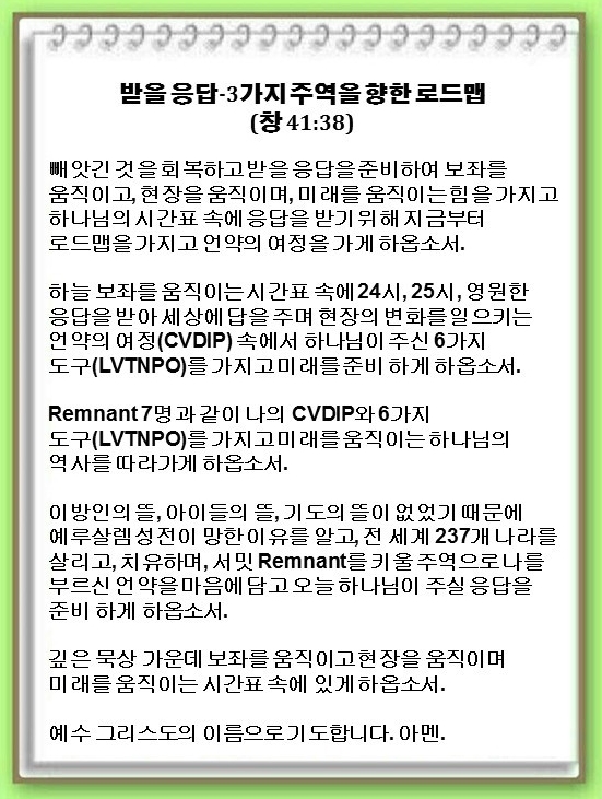 하나님이 전 세계 237개 나라를 살리고 치유하며, 서밋 Remnant를 키울 주역으로 나를 부르셨습니다. 하나님이 이 일을 위해 모든 응답도 주셨습니다. 빼앗긴 것을 회복하고 받을 응답을 준비해야 합니다. 보좌를 움직이고, 현장을 움직이며, 미래를 움직이는 시간표입니다. 이 응답을 위해 지금부터 해야 할 로드맵이 무엇일까요?