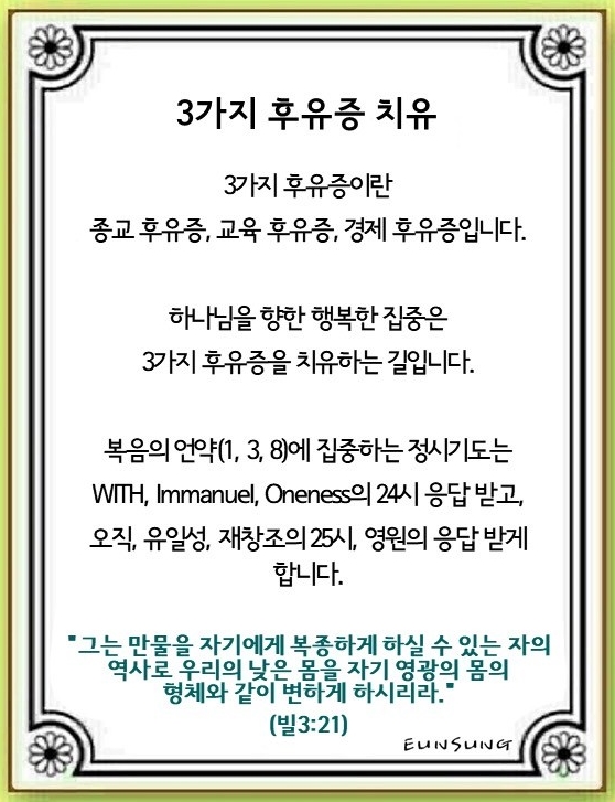 사탄이 준 12가지 문제, 즉 영적 문제로 인해 세계에 재앙이 임했고, 3가지 후유증이 왔습니다. 오직 하나님만 이 문제를 치유하실 수 있습니다. 그래서 하나님은 복음 가진 나를 하나님의 사람으로 부르셨습니다. 과연 3가지 후유증은 무엇이고, 어떻게 치유할 수 있을까요?