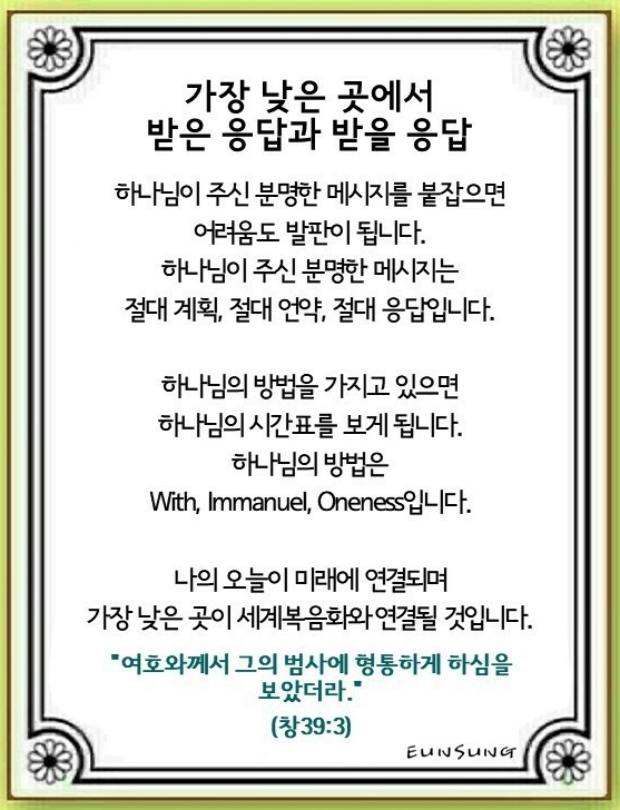 하나님이 주신 분명한 메시지를 붙잡으면 어려움도 발판이 됩니다. 요셉은 하나님이 주신 세계복음화의 꿈을 꾸고 있었습니다. 그래서 노예로 간 애굽 현장에서도 기도하며 최선을 다했습니다. 그런 요셉을 보고 보디발이 하나님이 요셉과 함께 하심을 고백했습니다.