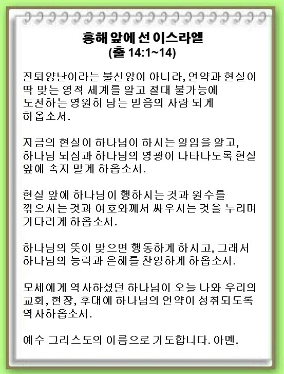 홍해를 맞닥뜨린 이스라엘 뒤에 애굽 군대가 따라왔습니다. 많은 사람이 걱정했지만 나아갈 길은 하나뿐이었습니다. 하나님의 뜻을 따라 가나안에 가기 위해 홍해를 건너야 하는 것입니다. 홍해 앞에서 하나님의 말씀은 잊은 채 사람의 소리만 듣는 사람들이 있는가 하면, 모세처럼 확실한 말씀을 붙잡고 기도하는 사람도 있었습니다. 홍해 앞에 선 이스라엘 백성을 보면서 내가 가져야 할 신앙은 무엇일까요?