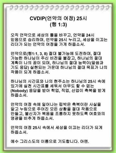 | CVDIP(언약의 여정) 24시(사도행전 27:24)-기도수첩 (0) | 2020.07.27 |