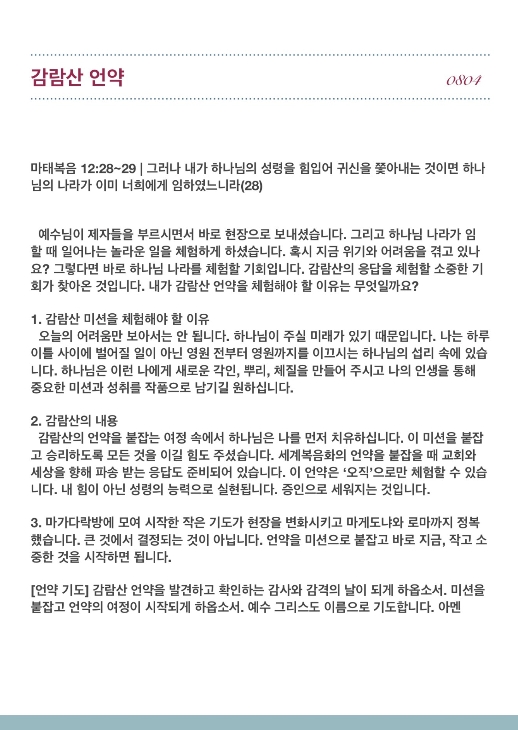 감람산의 언약을 붙잡는 여정 속에서 하나님은 나를 먼저 치유하십니다. 이 미션을 붙잡고 승리하도록 모든 것을 이길 힘도 주셨습니다. 세계복음화의 언약을 붙잡을 때 교회와 세상을 향해 파송 받는 응답도 준비되어 있습니다. 이 언약은 ‘오직’으로만 체험할 수 있습니다. 내 힘이 아닌 성령의 능력으로 실현됩니다. 증인으로 세워지는 것입니다.