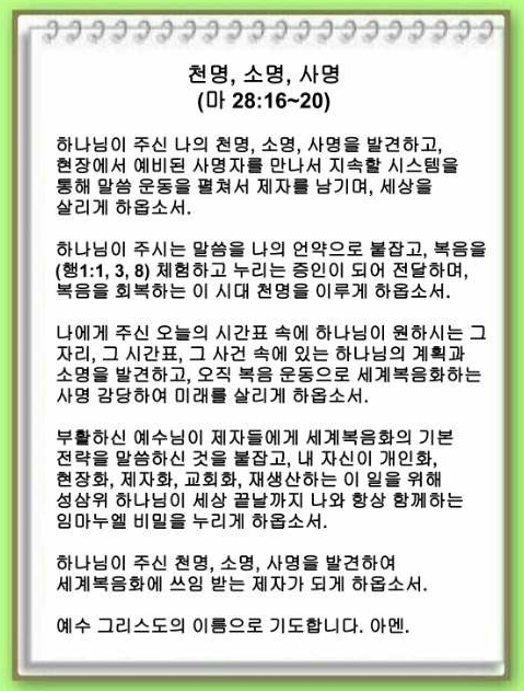 [언약 기도] 하나님이 주신 천명, 소명, 사명을 발견하여 세계복음화에 쓰임 받는 제자가 되게 하옵소서. 예수 그리스도 이름으로 기도합니다. 아멘