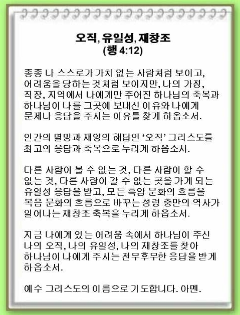 [언약 기도] 하나님이 주신 나의 오직, 나의 유일성, 나의 재창조를 찾게 하옵소서. 예수 그리스도 이름으로 기도합니다. 아멘