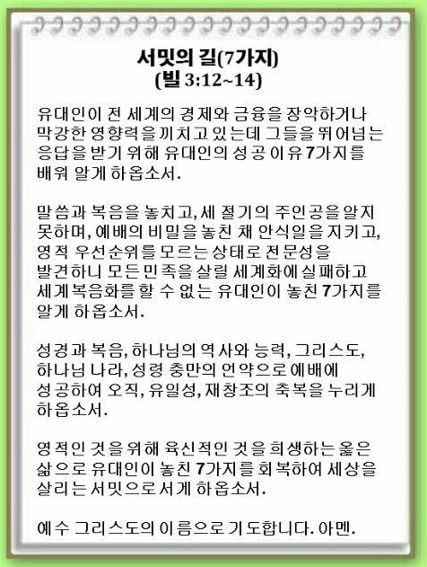 [언약 기도] 유대인이 놓친 7가지를 회복하여 세상을 살리는 서밋으로 서게 하옵소서. 예수 그리스도 이름으로 기도합니다. 아멘