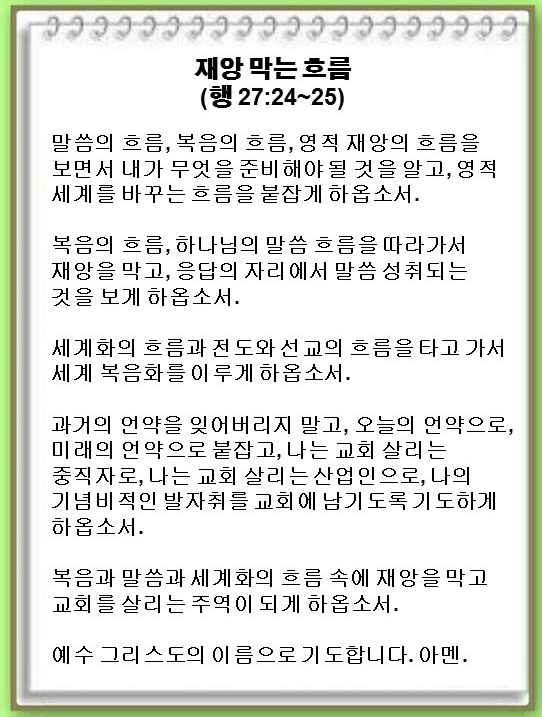 [언약 기도] 복음과 말씀과 세계화의 흐름 속에 재앙을 막고 교회를 살리는 주역이 되게 하옵소서. 예수 그리스도 이름으로 기도합니다. 아멘