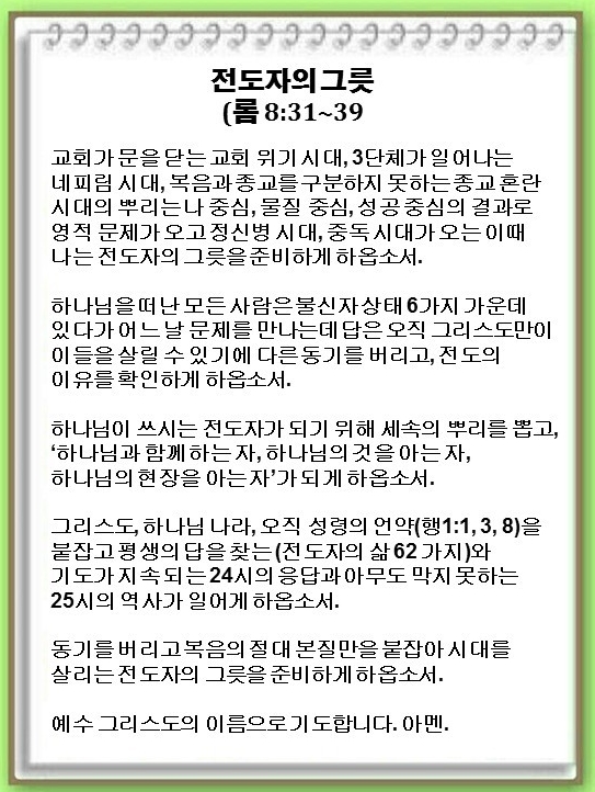 [언약 기도] 동기를 버리고 복음의 절대 본질만을 붙잡아 시대를 살리는 전도자의 그릇을 준비하게 하옵소서. 예수 그리스도 이름으로 기도합니다. 아멘