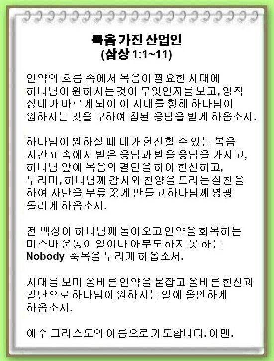 복음이 필요한 시대를 볼 때 영적 상태가 바르게 되고 응답이 옵니다. 자식이 없어 괴로워하던 한나는 계속 육신주의 기도를 했습니다. 브닌나를 시기, 질투하며 인본주의 기도를 했습니다. 마침내 한나가 이 시대에 하나님이 원하시는 것이 무엇인지 깨달았습니다. 그리고 이 시대를 향해 하나님이 원하시는 것을 구하기 시작했습니다.