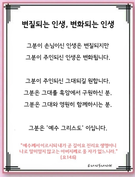유대인은 복음을 민족 사상, 메시아 사상, 율법 사상으로 바꾸었습니다. 초대교회는 베드로가 이방인(고넬료)의 집에 간 것을 문제 삼았습니다(행11:1~18). 로마 교회는 성공, 중세 교회는 정치, 현대 교회는 물질에 무릎 꿇었습니다. 하나님은 변질이 아닌 변화된 교회를 원하십니다. 변화된 교회는 과연 어떤 교회일까요?
