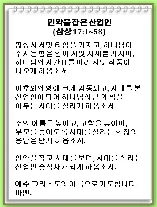 [언약 기도] 언약을 잡고 시대를 보며, 시대를 살리는 산업인 중직자가 되게 하옵소서. 예수 그리스도 이름으로 기도합니다. 아멘