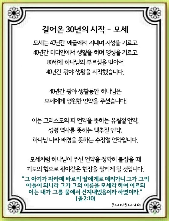 모세는 왕궁 생활 40년 동안 지성을, 미디안 생활 40년 동안 영성을 기르고, 광야 생활 40년 동안 영원한 언약을 확인했습니다. 이 시대의 Remnant인 나에게도 하나님이 주신 언약이 있습니다. 이 언약을 정확히 붙잡을 때 기도의 힘으로 현장을 살리게 될 것입니다.