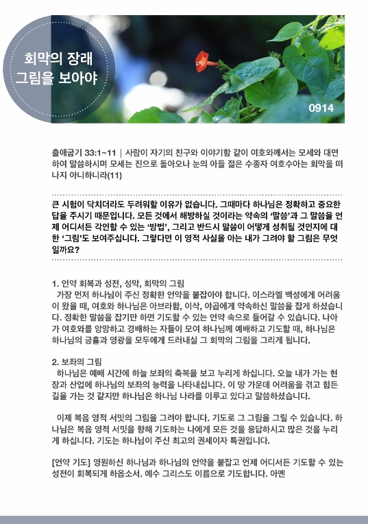 가장 먼저 하나님이 주신 정확한 언약을 붙잡아야 합니다. 이스라엘 백성에게 어려움이 왔을 때, 여호와 하나님은 아브라함, 이삭, 야곱에게 약속하신 말씀을 잡게 하셨습니다. 정확한 말씀을 잡기만 하면 기도할 수 있는 언약 속으로 들어갈 수 있습니다. 나아가 여호와를 앙망하고 경배하는 자들이 모여 하나님께 예배하고 기도할 때, 하나님은 하나님의 긍휼과 영광을 모두에게 드러내실 그 회막의 그림을 그리게 됩니다.