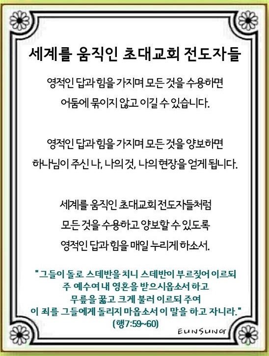 하나님의 것을 발견한 이들은 모든 것을 양보했습니다(행1:1~8, 14). 마가다락방에서의 놀라운 응답과 앉은뱅이를 일으키는 역사도 체험했습니다(행3:1~12). 구원의 유일한 이름(행4:12)을 가졌기에 죽음도 그들을 이길 수 없었습니다(행7:1~60). 오히려 아무도 가지 못하는 현장에 가서(행8:4~8) 세계 선교의 문을 열었습니다(행11:19, 13:1~4). 모든 것을 잃어도 하나님이 만드신 나, 하나님이 주신 나의 것, 나의 현장에만 집중한 것입니다.