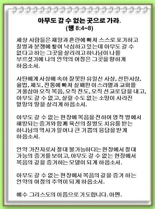 [언약 기도] 아무도 갈 수 없는 현장에서 복음의 길을 증거 하는 언약의 여정의 주역이 되게 하옵소서. 예수 그리스도 이름으로 기도합니다. 아멘