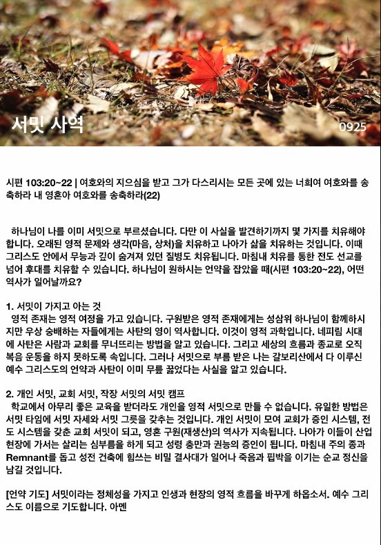 영적 존재는 영적 여정을 가고 있습니다. 구원받은 영적 존재에게는 성삼위 하나님이 함께하시지만 우상 숭배하는 자들에게는 사탄의 영이 역사합니다. 이것이 영적 과학입니다. 네피림 시대에 사탄은 사람과 교회를 무너뜨리는 방법을 알고 있습니다. 그리고 세상의 흐름과 종교로 오직 복음 운동을 하지 못하도록 속입니다. 그러나 서밋으로 부름 받은 나는 갈보리산에서 다 이루신 예수 그리스도의 언약과 사탄이 이미 무릎 꿇었다는 사실을 알고 있습니다.