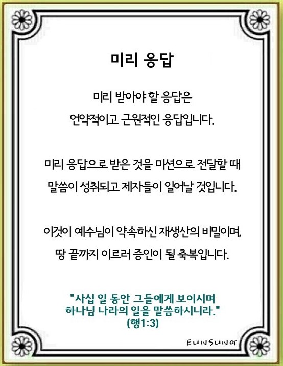 하나님의 언약을 붙잡은 자에게는 반드시 미리 응답이 옵니다. 응답이 없는 것 같아 보이는 이유는 문제를 하나님 앞에 내려놓지 않고, 틀린 것을 포기하지 않아 하나님이 응답을 지연하셨기 때문입니다. 하나님은 복음을 회복하는 절대 언약을 붙잡기를 원하십니다. 그렇다면 내가 미리 받아야 할 응답의 내용은 무엇일까요?