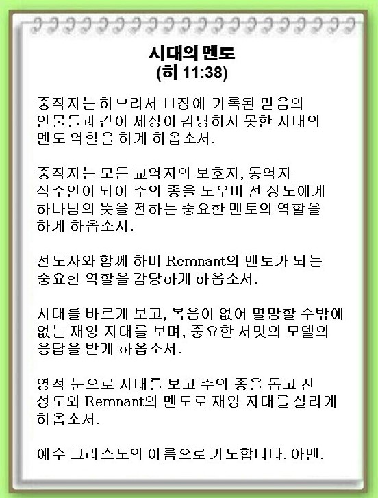 [언약 기도] 영적 눈으로 시대를 보게 하옵소서. 주의 종을 돕고 전 성도와 Remnant의 멘토로 재앙 지대를 살리게 하옵소서. 예수 그리스도 이름으로 기도합니다. 아멘