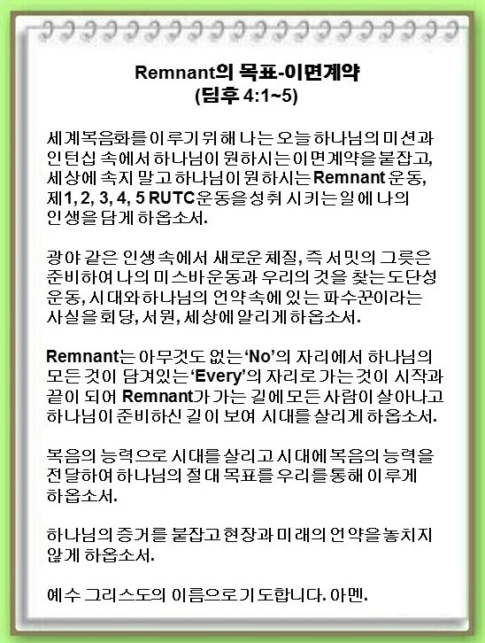 Remnant는 시작과 끝을 분명히 알아야 합니다. Remnant는 아무것도 없는 ‘No’의 자리에서 하나님의 모든 것이 담겨있는 ‘Every’의 자리로 가게 됩니다. 하나님이 준비해두신 Remnant가 가는 길에는 모든 사람이 살아나고 하나님이 준비하신 길이 보입니다. 하나님은 남은 시대를 Remnant에게 맡기십니다. 이것이 Remnant의 시작과 끝입니다.