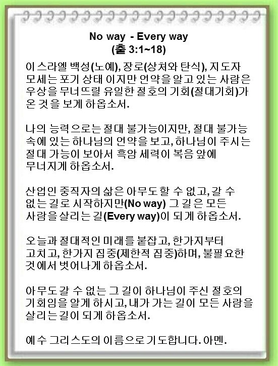 [언약 기도] 아무도 갈 수 없는 그 길이 하나님이 주신 절호의 기회임을 알게 하시고, 내가 가는 길이 모든 사람을 살리는 길이 되게 하옵소서. 예수 그리스도 이름으로 기도합니다. 아멘