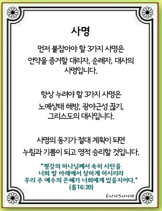 사명이란 반드시 해야 할 일입니다. 그러나 사명의 동기가 나의 유익이어서는 안 됩니다. 사명의 동기가 하나님의 절대 계획으로 바뀌어야 합니다. 그러면 나에게 누림이 되고, 기쁘게 전달할 수 있고, 흑암 세력을 무너뜨리는 영적 도전에 승리할 것입니다.
