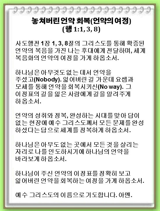 [언약 기도] 하나님이 주신 언약의 이정표를 정확히 보고 잃어버린 언약을 회복하는 여정을 가게 하옵소서. 예수 그리스도 이름으로 기도합니다. 아멘