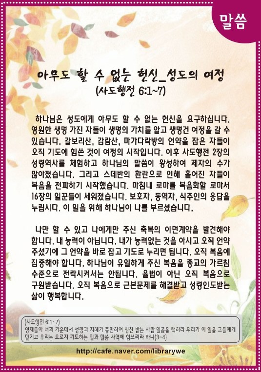 아무도 할 수 없는 헌신_성도의 여정(사도행전 6:1~7)