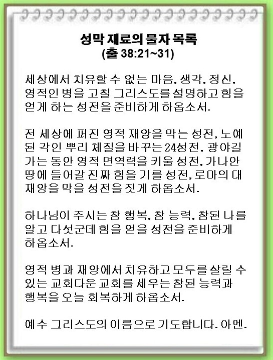 전 세계가 영적 병으로 어려움을 겪고 있습니다. 영적 병은 그리스도 안에 있는 영적 힘으로만 고칠 수 있습니다. 그래서 그 영적 힘을 얻을 수 있는 성막과 성전을 지어야 합니다. 과연 어떤 성전을 지어야 할까요?