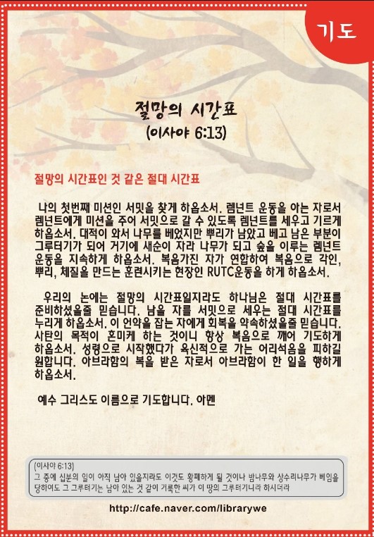 가장 큰 응답은 절망의 시간에 옵니다. 지금의 어려움이 절망의 시간으로 보일 수 있지만 하나님은 절대 시간표를 주신 것입니다. 남은 자를 서밋으로 세우는 RUTC 운동은 희망의 시간표입니다. 하나님은 이 언약을 보는 자에게 회복을 약속하셨습니다(사6:13).