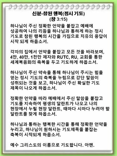 이때부터 하나님이 주신 확실한 기도제목이 나옵니다. 하나님의 말씀을 붙잡고 기도하며, 강단 말씀이 성취되는 것을 보고, 감사를 넘어 설렘이 나옵니다. 그리고 정시 기도를 통해서 평안을 누릴 만큼 깊은 기도를 누리는 것입니다. 하나님이 주신 약속을 통해 하나님이 주시는 힘을 얻는 것이 정시 기도의 축복입니다.