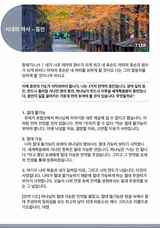 이제 증인의 기도가 시작되어야 합니다. 나는 3가지 언약의 증인입니다. 광야 길의 증인, 반드시 들어갈 가나안 땅의 증인, 하나님이 반드시 이루실 세계복음화의 증인입니다. 증인의 길을 걸어가는 가운데 먼저 보아야 할 것이 있습니다. 무엇일까요?