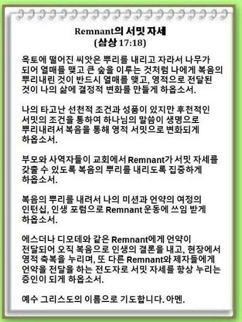 에스더나 디모데와 같은 Remnant에게 언약이 전달되면 오직 복음으로 인생의 결론을 낼 수 있습니다. 나의 현장에서 영적 축복을 누리며 살 수 있습니다. 또 다른 Remnant와 제자들에게 언약을 전달을 하는 전도자로 서밋 자세를 항상 누리는 증인이 됩니다.