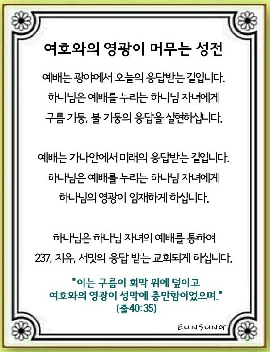 이스라엘 백성이 광야 생활 40년간 성막에 모여서 예배할 때, 하나님의 영광을 확인했습니다. 이 축복을 나의 삶의 현장에서 누리는 것이 장막입니다. 하나님은 지금도 장막을 누리는 하나님 자녀에게 구름 기둥, 불 기둥의 응답을 실현하고 계십니다.