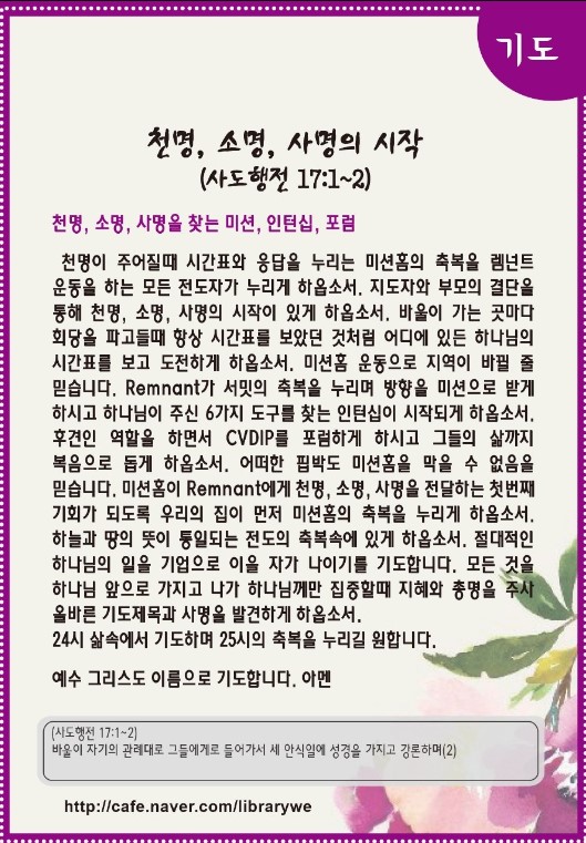 [언약 기도] 아무도 막을 수 없는 미션홈 전략으로 Remnant에게 천명, 소명, 사명이 전달되게 하옵소서. 예수 그리스도 이름으로 기도합니다. 아멘