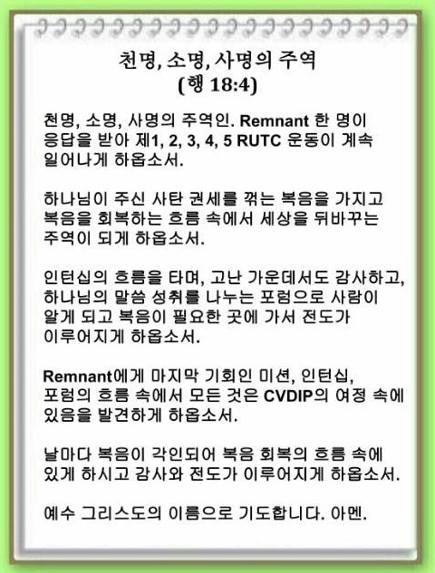 천명, 소명, 사명의 주역이 Remnant입니다. Remnant 한 명이 응답을 받으면 제1, 2, 3, 4, 5 RUTC 운동이 계속 일어납니다. 이 축복을 누리려면 3가지 흐름을 타야 합니다. 어떤 흐름일까요?