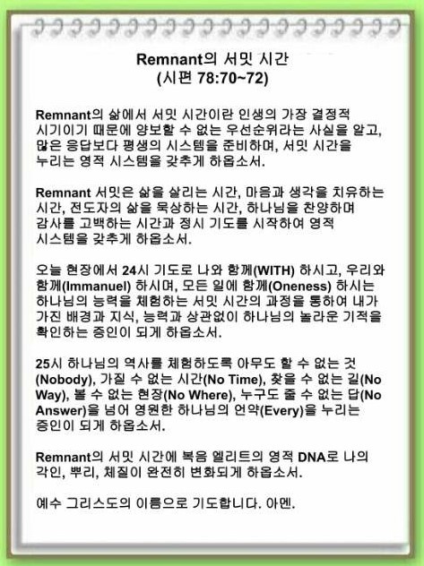Remnant의 때는 완성이나 응답보다 더 큰 축복(미래)을 준비하는 시기입니다. 오늘 현장에서 24시 기도로 나와 함께(WITH) 하시고, 우리와 함께(Immanuel) 하시며, 모든 일에 함께(Oneness) 하시는 하나님의 능력을 체험할 수 있습니다. 그러면 내가 가진 배경과 지식, 능력과 상관없이 하나님의 놀라운 기적을 확인하는 증인이 됩니다.