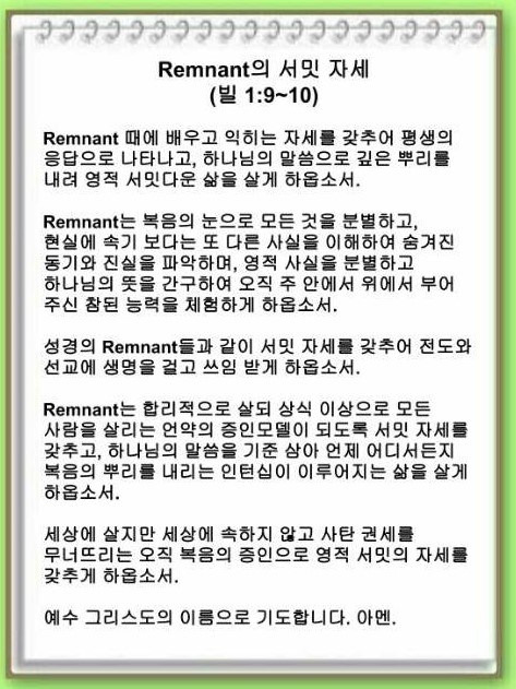 Remnant는 복음의 눈으로 모든 것을 분별해야 합니다. 현실에 속기 보다는 또 다른 사실을 이해하여 숨겨진 동기와 진실을 파악해야 합니다. 무엇보다 영적 사실을 분별하여 하나님의 뜻을 간구할 수 있어야 합니다. 바울은 감옥에 갇혔지만 매이지 않았습니다. 그리스도 예수께 잡힌 바 된 그것을 잡으려고 경주했습니다. 오직 주 안에서 위에서 부어주신 참된 능력을 체험했습니다.
