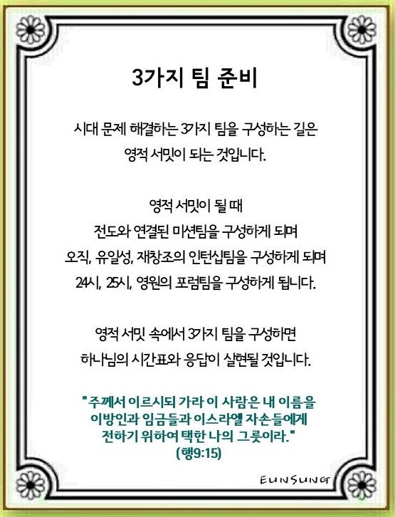 4차 산업혁명이 일어나면 많은 변화와 혼란이 올 것입니다. 특히 우울증, 조울증, 조현병, 공황증과 같은 정신병이 많이 생기게 됩니다. 그래서 성경은 이들을 살릴 3가지 팀(미션팀, 인턴십팀, 포럼팀) 준비를 설명하고 있습니다. 3가지 팀을 준비하려면 어떻게 해야 할까요?