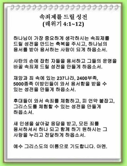 하나님은 이스라엘 백성이 먼저 용서와 회복을 누리고 이것을 모든 민족에게 전달하기를 원하셨습니다. 전 세계 237개 나라의 약 5천 개 부족과 종족이 복음을 받고 용서와 구원을 받아야 합니다. 영적 한계와 상처에 갇힌 사람이 치유 받을 교회가 필요합니다. 이 응답을 받은 나를 통해 후대가 속죄제의 비밀을 확인하고 그리스도의 비밀을 누릴 수 있게 될 것입니다.
