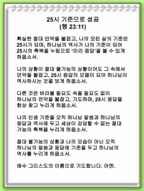나의 모든 삶의 기준은 25시가 되어야 합니다. 즉, 하나님의 역사가 나의 기준이 되어야 합니다. 하나님이 역사하시는 확실한 절대 언약을 붙잡으면 25시의 축복을 누릴 수 있고 ‘미리 응답’을 볼 수 있게 됩니다. 그렇다면 어떻게 25시를 확인할 수 있을까요?
